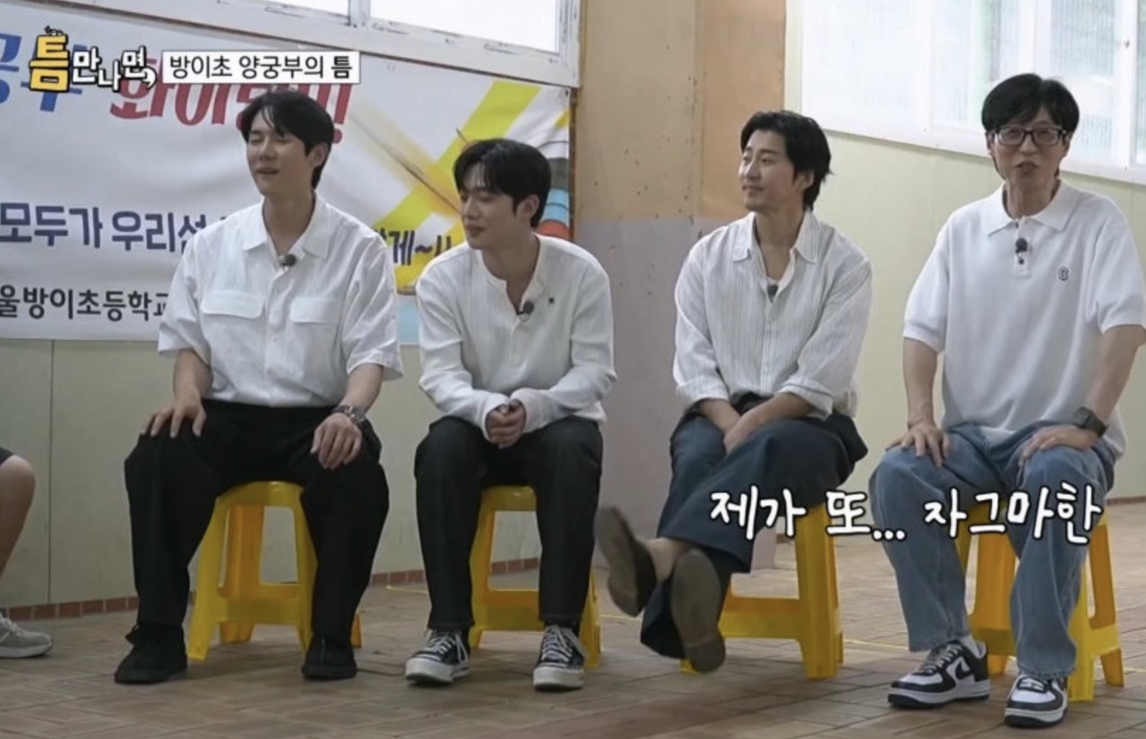 마지막으로 네 사람이 찾은 틈 주인은 방이초 양궁부 선수들이었습니다. 특히 김요한 씨는 "저도 태권도 선출이었다"라며 후배들을 위해 직접 발차기를 선보이고 운동 이야기에 공감하는 등 훈훈한 선배의 면모를 보였습니다. 뒤이은 두 번째 게임은 바로 '양궁'이었습니다. 윤계상 씨가 초반부터 연달아 10점을 쏘자 아이들은 "레전드다"라며 탄성을 질렀습니다. 3번째 도전에서 윤계상 씨, 유재석 씨가 연속 10점을 내며 1단계를 통과했습니다. 하지만 급 난이도가 올라가자 윤계상 씨, 김요한 씨는 "이거 한 30년 동안 꿈꿀 것 같아", "시합 뛸 때보다 더 떨린다"라며 부담감을 호소했습니다. 유재석 씨가 "한 번 기적을 만들어보자"라고 마지막 도전을 응원했지만 아쉽게도 실패로 돌아갔습니다.