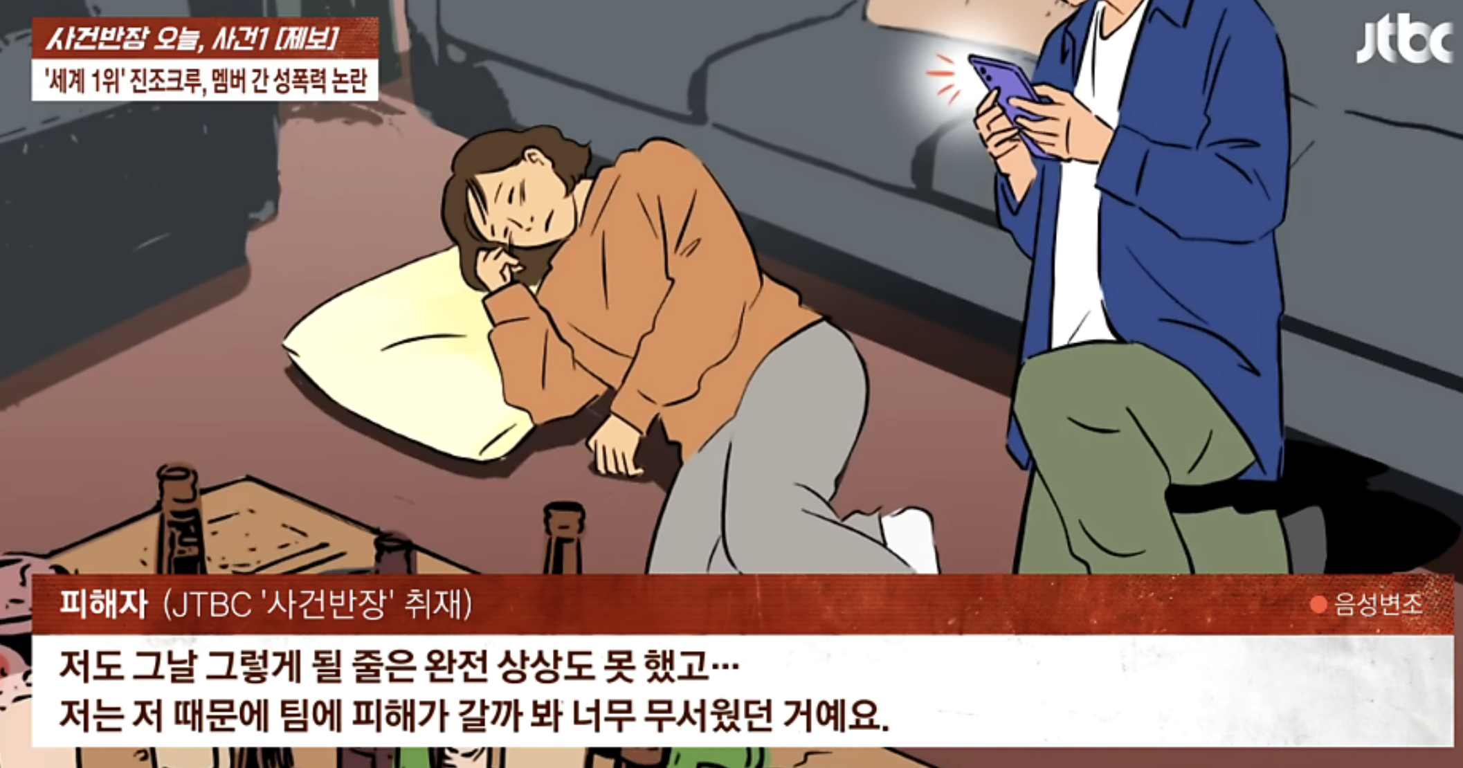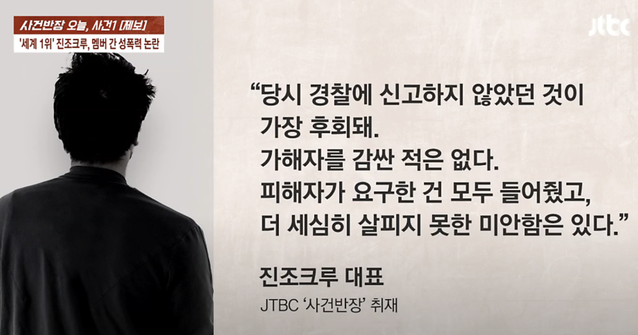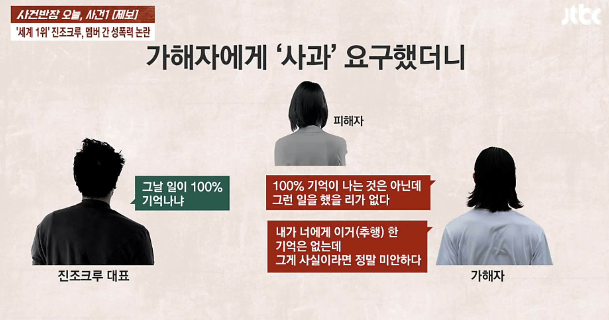 '사건 발생 6개월 후', A 씨가 '진조크루 대표'에게 피해 사실을 털어놓았지만, 대표는 "그럴이유가없다"며 '가해자'를 '두둔'했습니다. '삼자대면 자리'에서 '가해자'는 "기억이없다"며 '가벼운 사과'로 일관했고, 대표는 A 씨를 비판하는 듯한 발언을 이어가며 '2차가해'를 일으켰습니다. 대표는 "근친상간은없다"거나 "잡종" 같은 '부적절한 표현'을 사용해 A 씨에게 '수치심'을 안겼습니다.