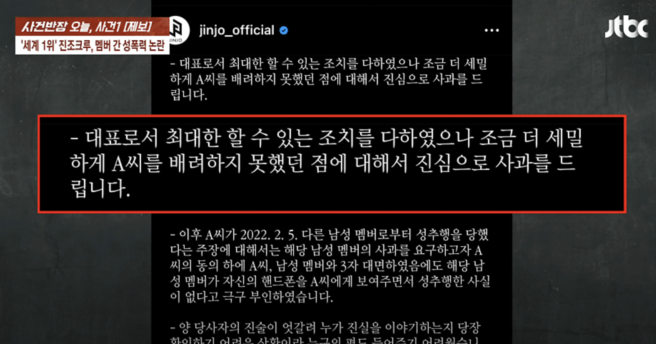 저는 이 '2차 가해'에서 '피해자'를 '보호'해야 할 '팀 대표'가 '피해자'를 '외면'하고 '가해자'를 '두둔'하는 '충격적인 모습'을 느낄 수 있었으며, 깊이 분노했습니다. '진조크루' 측은 "가해자를 감싼 것이 아니며, 피해자 요구를 들어주려 했다"고 주장했지만, A 씨는 '진정한 사과'를 받지 못했다고 호소했습니다.