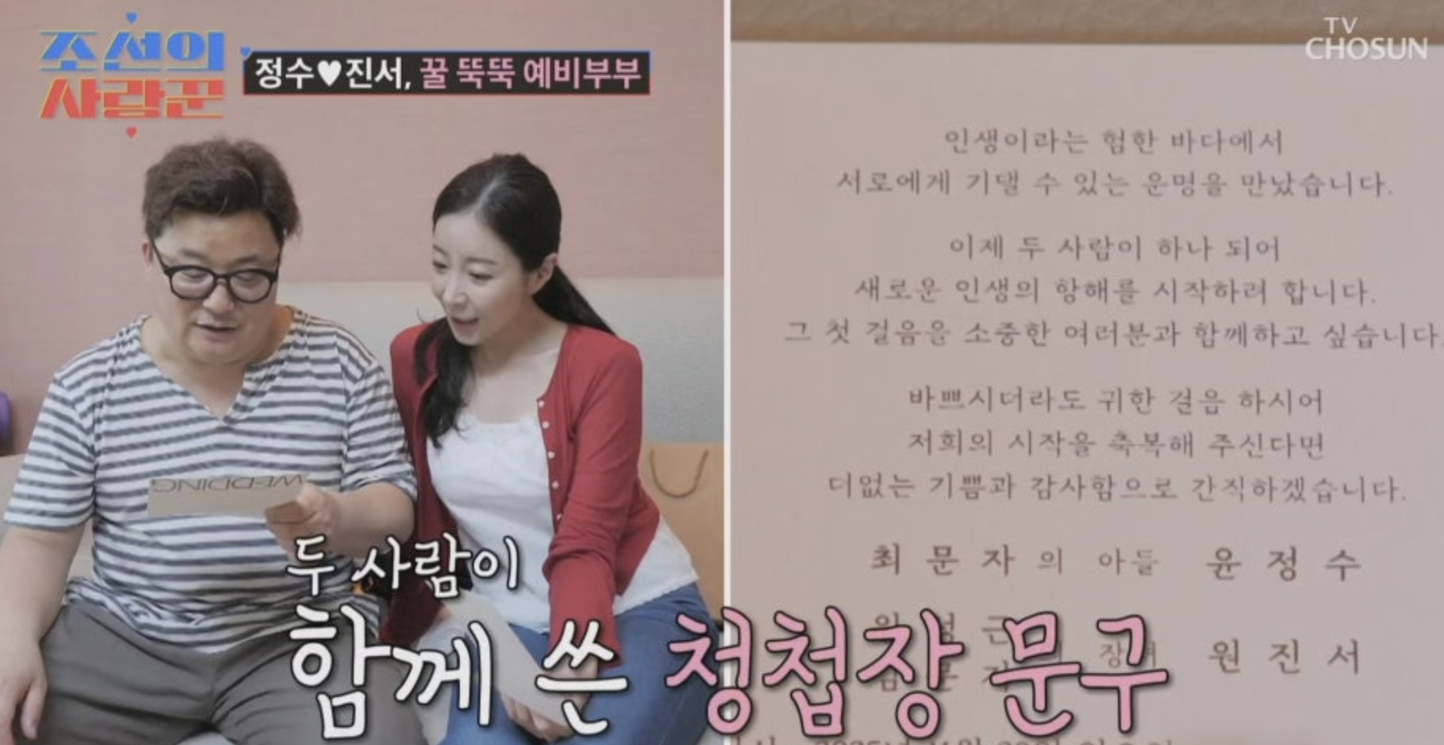 '신혼집'에는 '10년 전 세상을 떠난 어머니'의 '유품'도 '정성스럽게 보관'돼 있었는데요. 윤정수는 "엄마냄새가나는것같아태울수없었다"라고 말했고, 강수지는 '공감'했습니다. 이후 '예비 신부' 원진서가 '청첩장'을 들고 집을 방문. '두 사람'의 '어머니 성함'이 '같다'는 사실을 발견하자 '황보라'는 "운명"이라며 '감탄'했습니다.